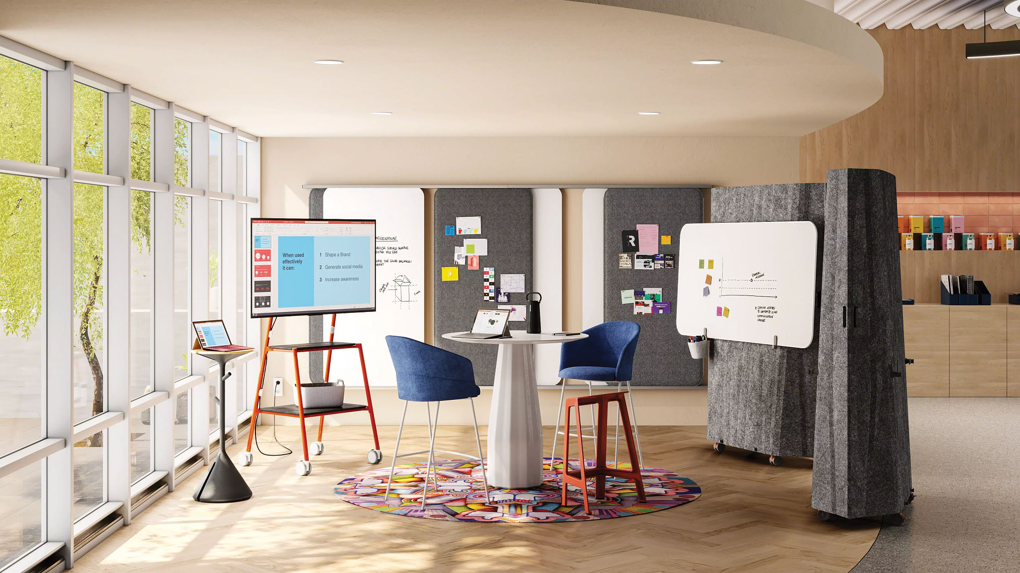 Moderne Technologien spielen ebenfalls eine zentrale Rolle bei der Raumgestaltung. Hybride Technik, die Teams vor Ort und aus dem Home-Office zusammenführt, ist unverzichtbar. Interaktive Whiteboards und Videokonferenzsysteme erleichtern die Zusammenarbeit und Kommunikation innerhalb und zwischen Teams. Diese Technologien fördern den Informationsaustausch und ermöglichen es den Mitarbeiterinnen und Mitarbeitern, effizienter zu arbeiten.