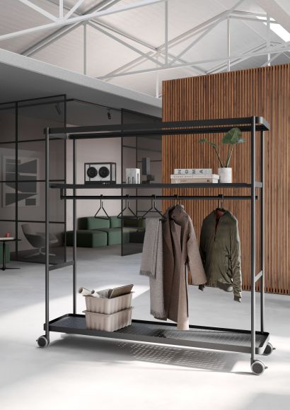- Regale, die sich zusätzlich als Garderobe oder Medienwagen konfigurieren lässt.