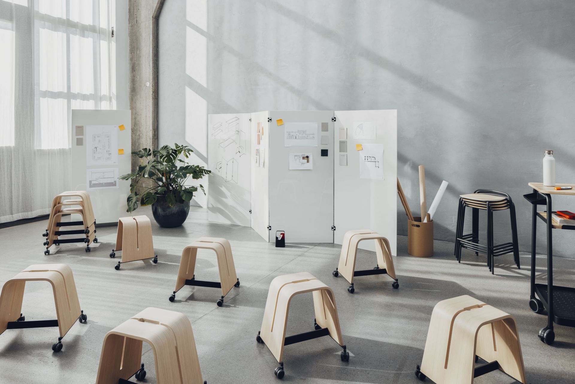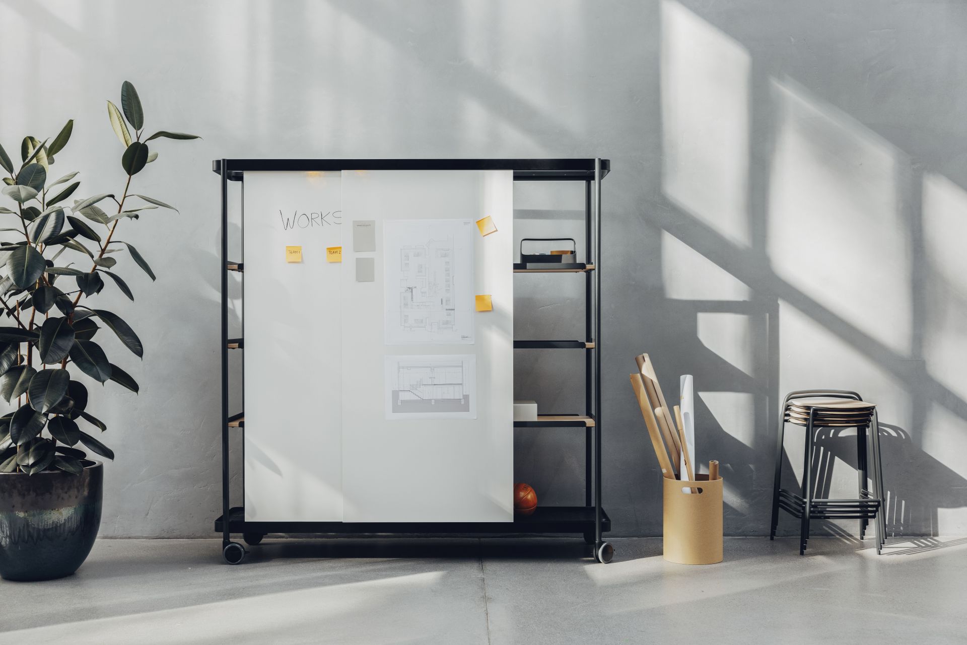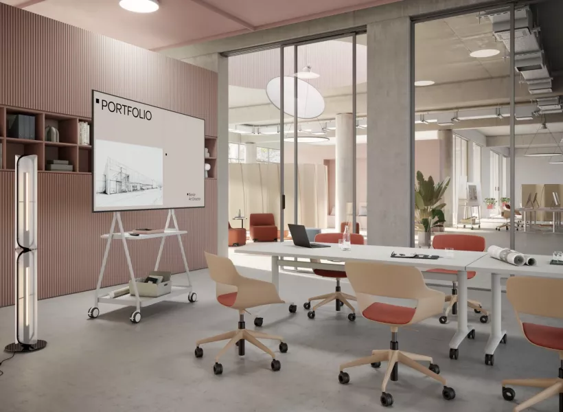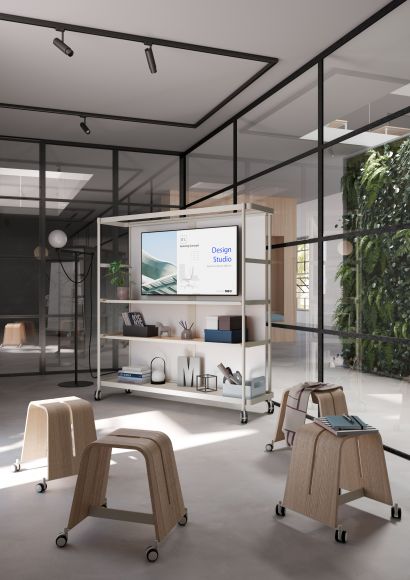 Das Whiteboard bildet das Herzstück der Serie. Es ist ultraleicht, beidseitig beschreibbar und optional magnethaftend. Es lässt sich in Tische, Hocker und Regale integrieren oder einfach mitnehmen. Ihre Teams können Ideen und Gedanken sammeln, „parken“ und ins nächste Meeting mitnehmen. Eine Methodik, die besonders vorteilhaft ist, wenn Mitarbeitende kreativ und dynamisch arbeiten.
