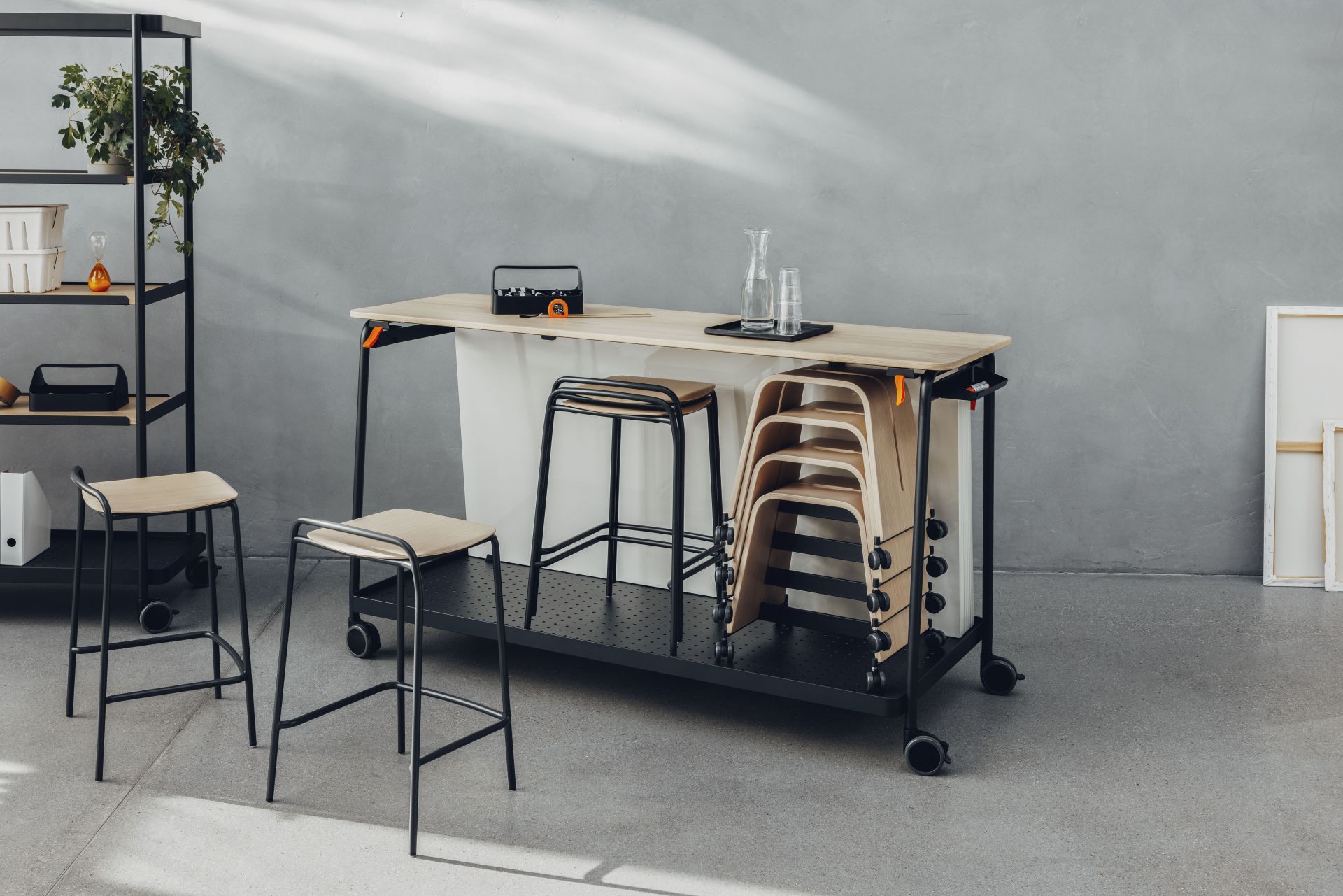 - Erweiterbares System: Tische, Hocker, Regale und Lagerwagen bieten zusätzliche Funktionen wie Präsentationsflächen.