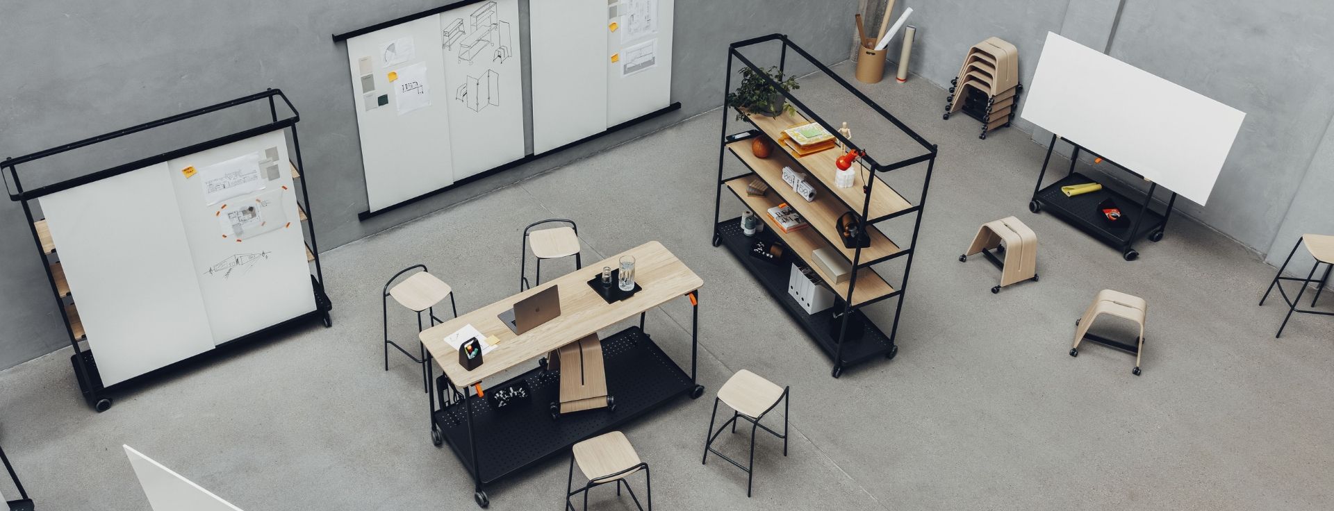 - Zubehör, wie Whiteboard-Verbinder, Toolboxen, Elektrifizierung und Wandschienen für maximale Funktionalität.