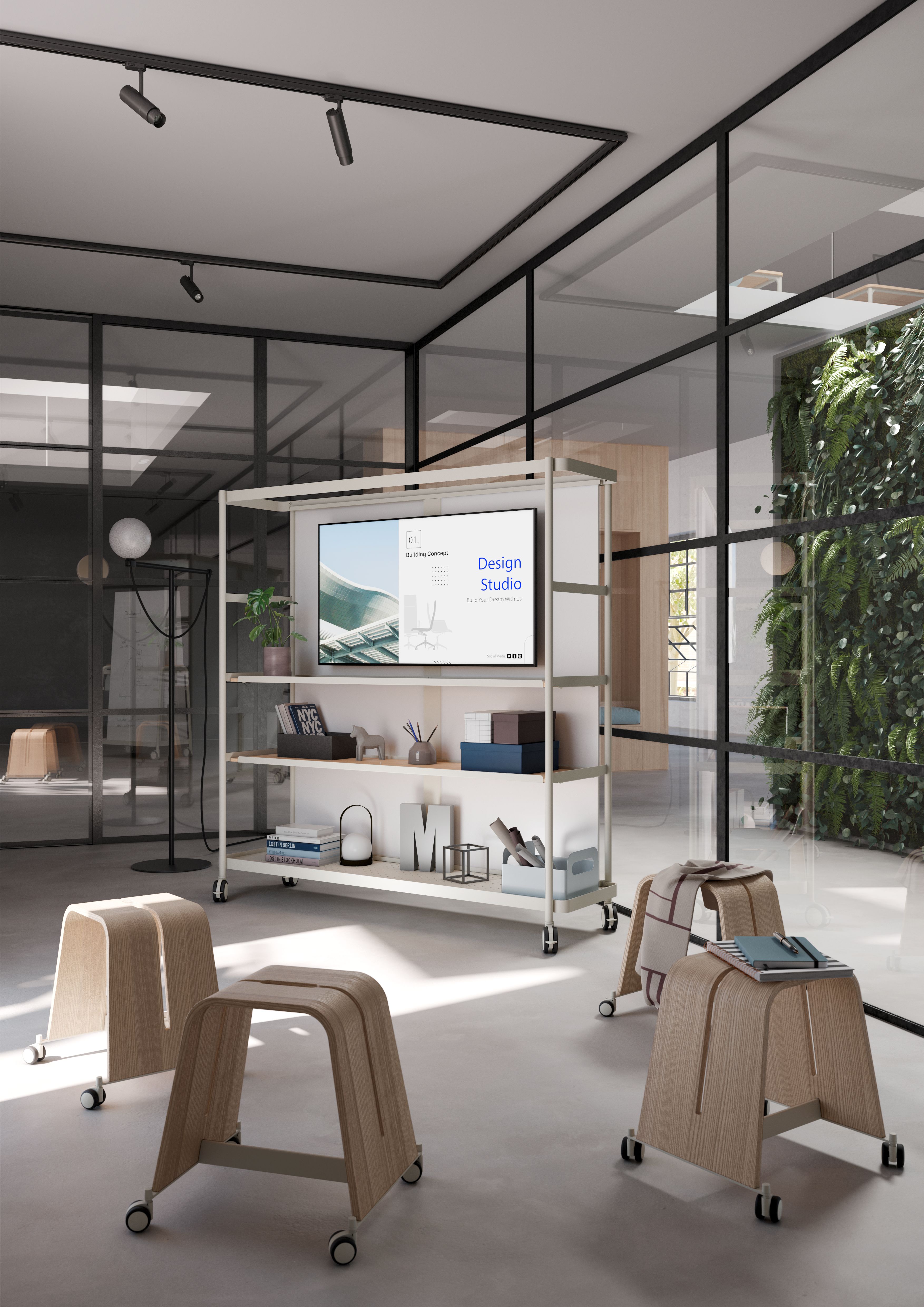 Der Medientrolley stellt eine konsequente Erweiterung der Boards-Serie dar. Die robuste Stahlkonstruktion, die praktischen Ablageflächen und die Bildschirmhalterung für große Screens machen ihn zur idealen Lösung für digitale Meetings und Präsentationen.