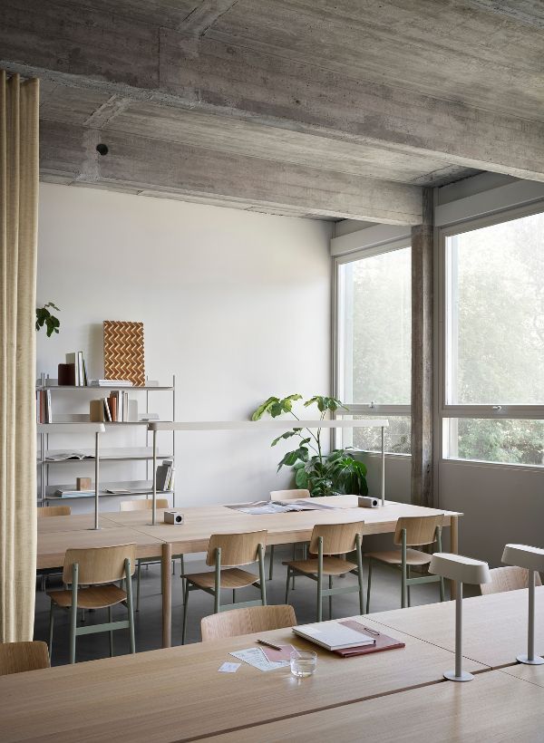 Cloud Dancer bietet eine klare Grundlage für mobile Boards, helle Möbel und Pastellakzente — etwa Hocker in Mint oder Akustikpaneele in Lavendel. Der Raum bleibt leicht, inspirierend und flexibel.