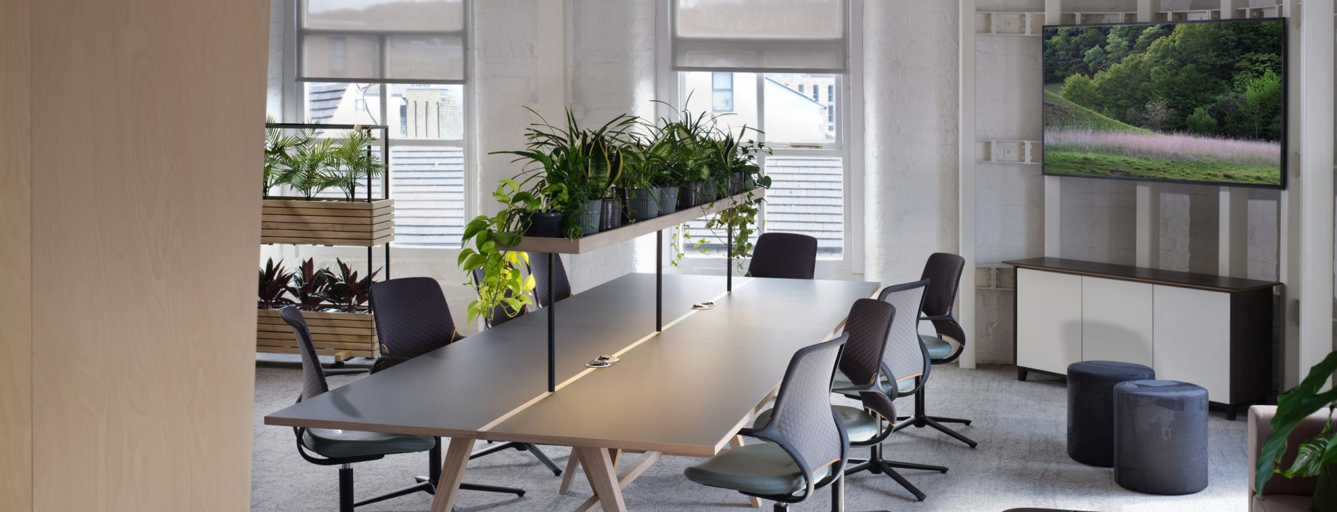 Die Forschung unserer Partners Steelcase zu “Biophilic Design” zeigt, dass die natürliche Umgebung nicht nur als visuelle Stimulation dient, sondern auch die kreative Denkweise und das Problemlösungsvermögen unterstützt. Die biophile Gestaltung, die die Verbindung zwischen Menschen und Natur in den Mittelpunkt stellt, betont, dass diese Verbindung grundlegend für die geistige Produktivität und das emotionale Wohlbefinden ist.