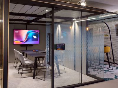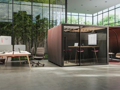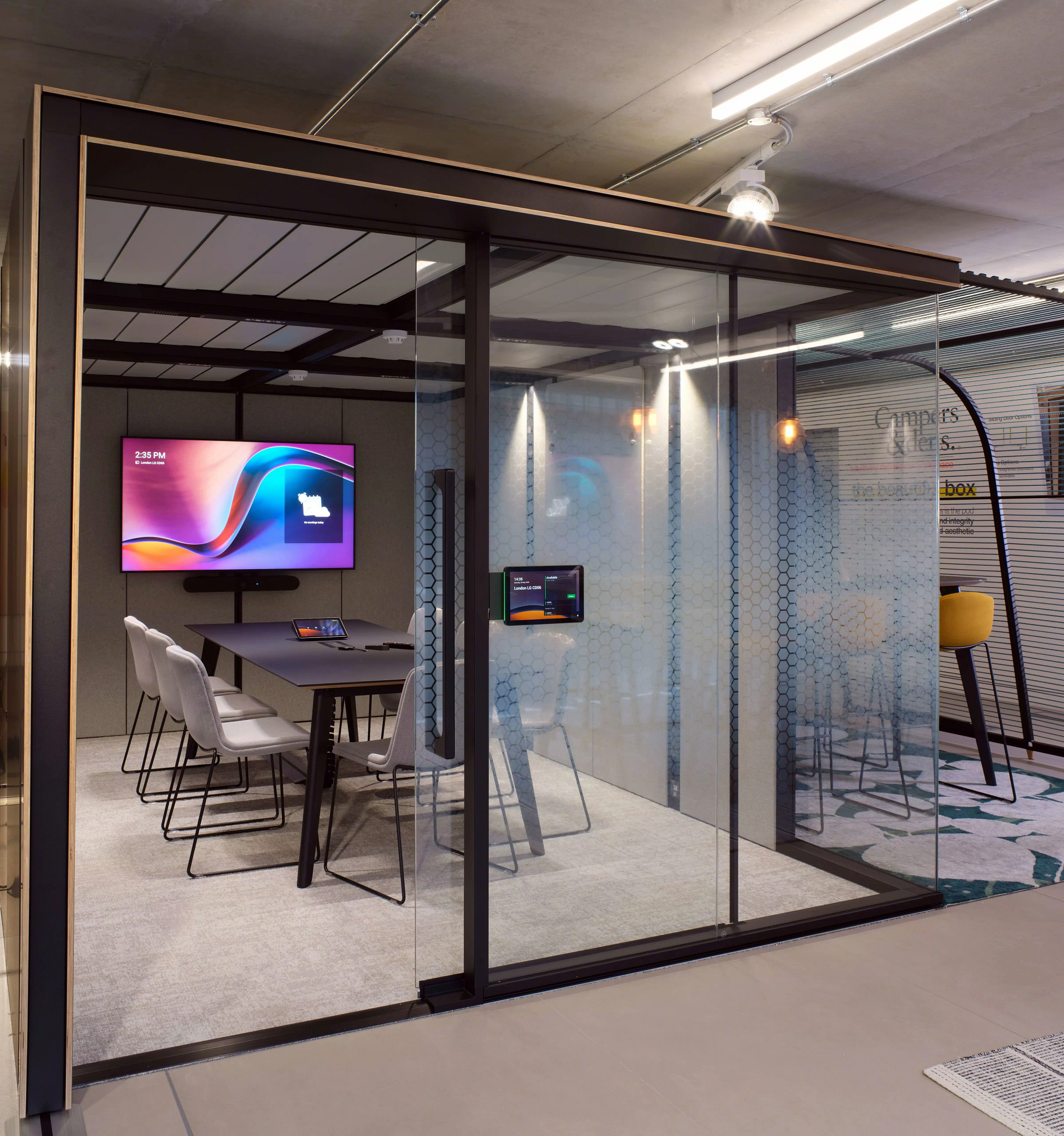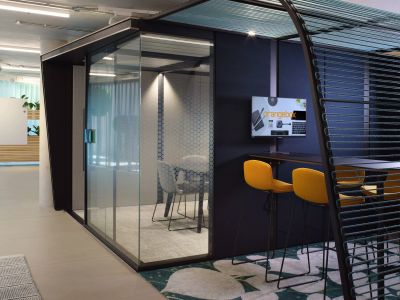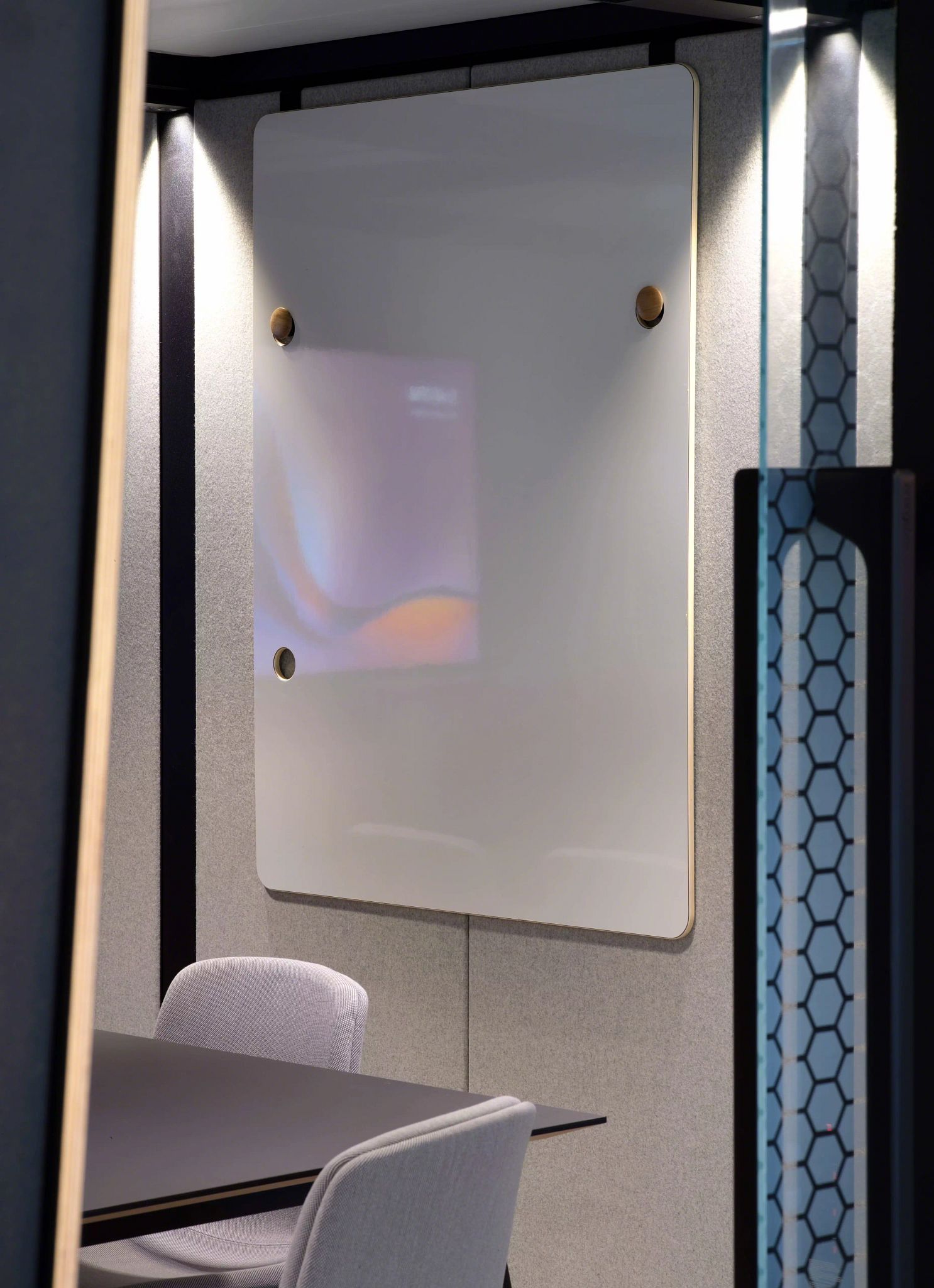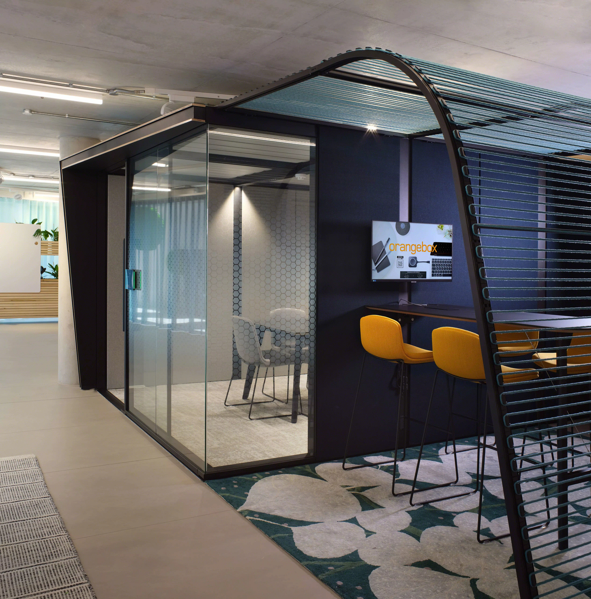 Die geschlossene Einheit bietet eine akustische Abschirmung, die konzentriertes Arbeiten und hybride Besprechungen ermöglicht. Die Verglasung schafft eine visuelle Verbindung zur Umgebung und vermittelt ein Gefühl der Offenheit. Der schräge Eingang verleiht eine persönliche Note und wirkt einladend.
