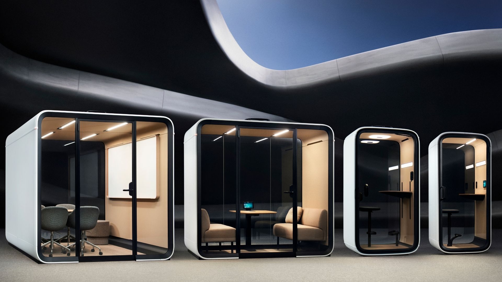 Ob digitales Team-Meeting oder Brainstorming in der Gruppe – die Telefonkabinen und Meeting Pods bieten alle Möglichkeiten, als Raum-in-Raum-Lösung die Arbeit im Team zu unterstützen. Die neue Generation der Framery Smart Pods umfasst vier hochfunktionale Raumlösungen, die auf unterschiedliche Anforderungen abgestimmt sind: