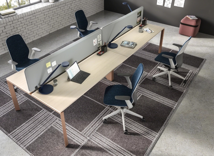 Fokuszone und Einzelarbeitsplätze: Hier empfiehlt sich die Kombination aus Tischtrennwand und freistehenden Elementen seitlich der Arbeitsplätze. So wird sowohl visuelle als auch akustische Ablenkung reduziert. Der Effekt ist besonders dann spürbar, wenn mehrere Stellwände zusammenwirken.