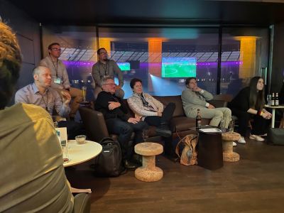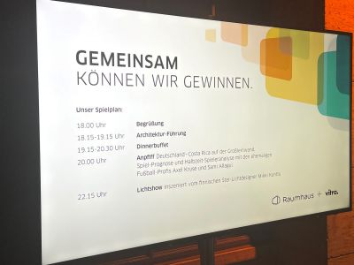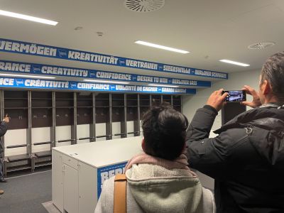 Nach dem Rundgang konnten wir alle in der Club Lounge von Vitra Platz nehmen und das WM-Spiel Deutschland gegen Costa Rica verfolgen. Überall zeigten TV-Monitore das Spiel, die man von Couch, Sofa, Stühlen oder Steh-Sitz-Gelegen verfolgen konnte. Auch vor der Großleinwand konnten wir mitfiebern. Auch, wenn unsere Nationalelf nicht weitergekommen ist, so haben wir doch einen Ort erlebt, der für Fußballfieber, Fankultur und Hospitality-Konzept rundum zum Ausdruck bringt.