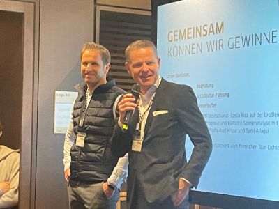 Ab 17:30 Uhr trudelten die ersten Gäste ein. Nach der Begrüßung durch Raumhaus-CEO Matthias Pranke und Vertriebspartner Marco Dimpker von Vitra ging es um 18 Uhr in sechs Gruppen durchs Berliner Olympiastadion. Das Gebäude wurde nach den Plänen des bekannten Architekten Werner March für die Olympischen Spiele 1936 gebaut und in den letzten Jahren und Rücksichtnahme des Denkmalschutzes behutsam erneuert – und dabei an die Bedürfnisse einer modernen Sportanlage angepasst. Der Gebäudekomplex ist riesig: Es gibt neben der Beflaggung am Rand des Oberrings, 75.000 überdachte Sitzplätze, Logen, Ehrentribünen, Pressetribünen, VIP-Anbau, Videoüberwachung durch die Polizei, Stadionkapelle, Reportergraben, eine unterirdische Aufwärmhalle mit 100-Meter-Bahnen, Umkleidekabinen im zweiten Untergeschoss sowie Technikräume und Tiefgaragen.