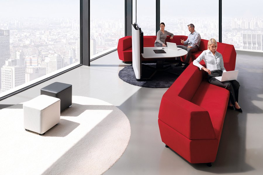 - Als Ort für Besprechungen mit Sitzlandschaften und Sitzwürfeln.