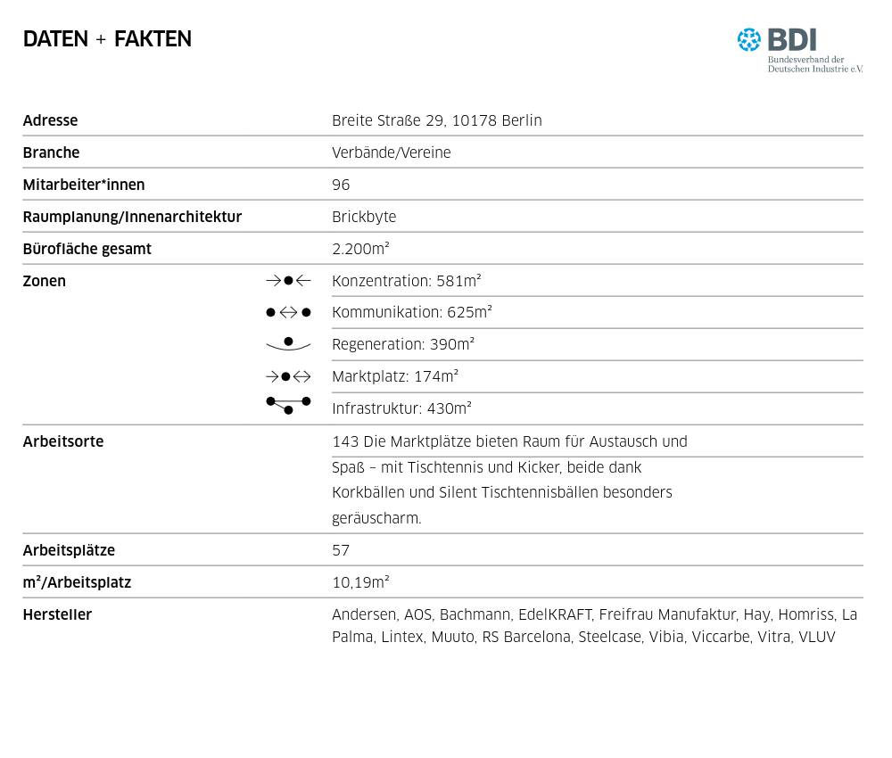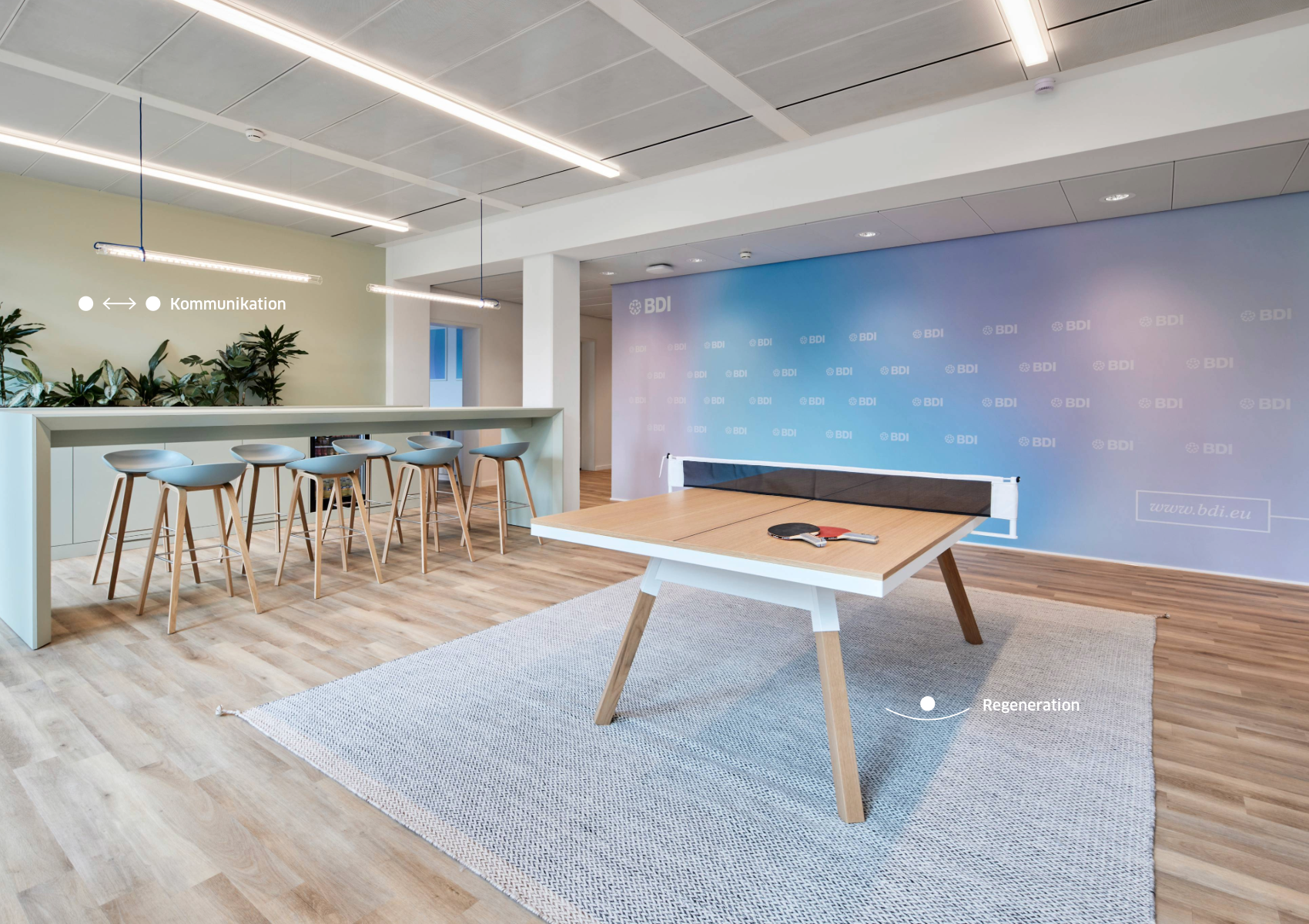 Die Planung der Raumausstattung übernahm die Unternehmensberatung Brickbyte, während Raumhaus die Lieferung und Montage des Mobiliars realisierte. Der BDI hat das New Work Konzept als Pilotprojekt auf den Etagen 1 und 4 umgesetzt.