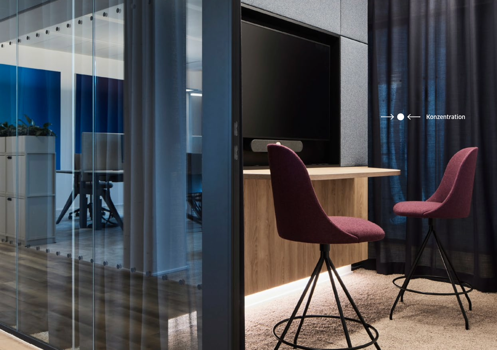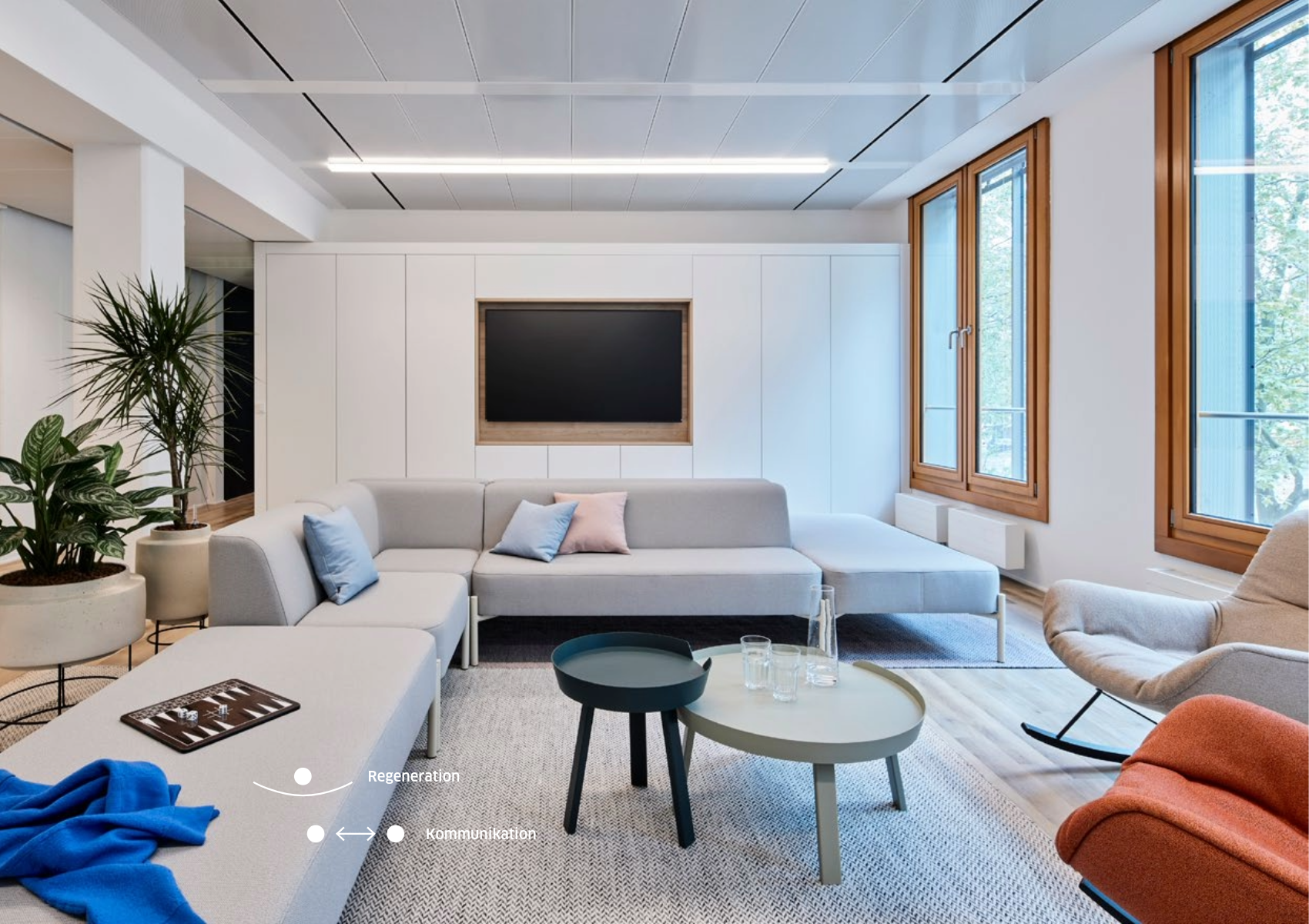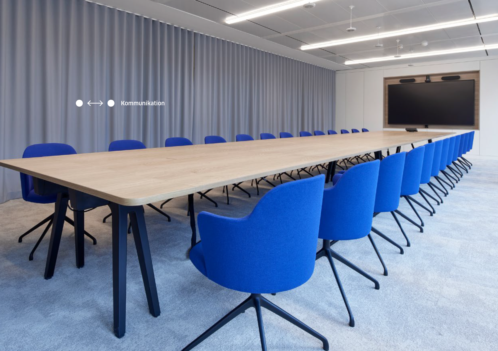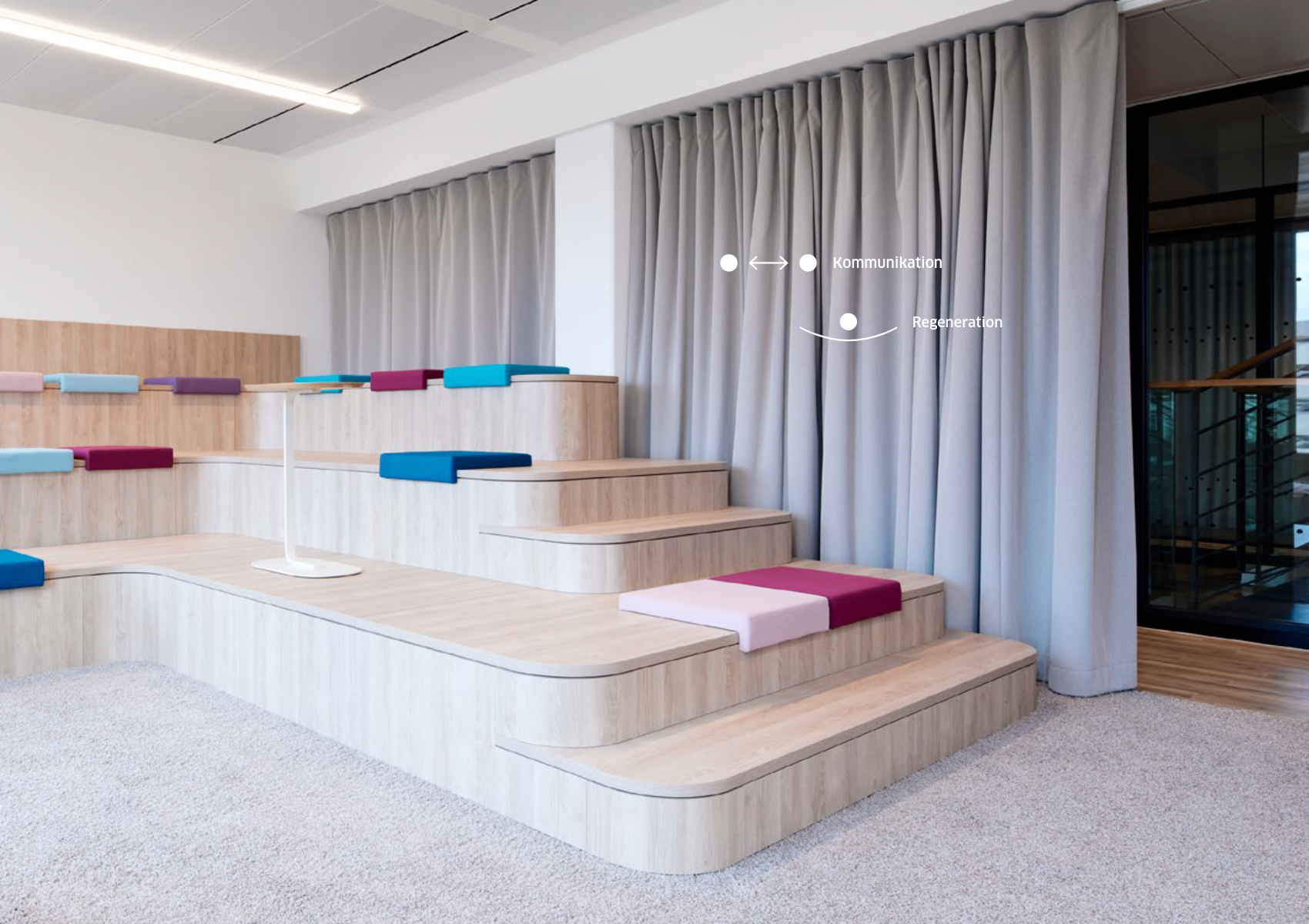 Der BDI hat zwei Etagen modernisiert und dabei auf New Work gesetzt: Offene, helle Räume statt einer geschlossenen Zellenofficestruktur schaffen eine wohnliche, einladende Atmosphäre. Für das Team stehen verschiedene Arbeitsorte bereit, die das Zusammenkommen und den Austausch ermöglichen. Ein Highlight ist der Innovation Space mit Sitztreppe und akustischen Vorhängen, die den Bereich flexibel zu einem Rückzugsort machen.